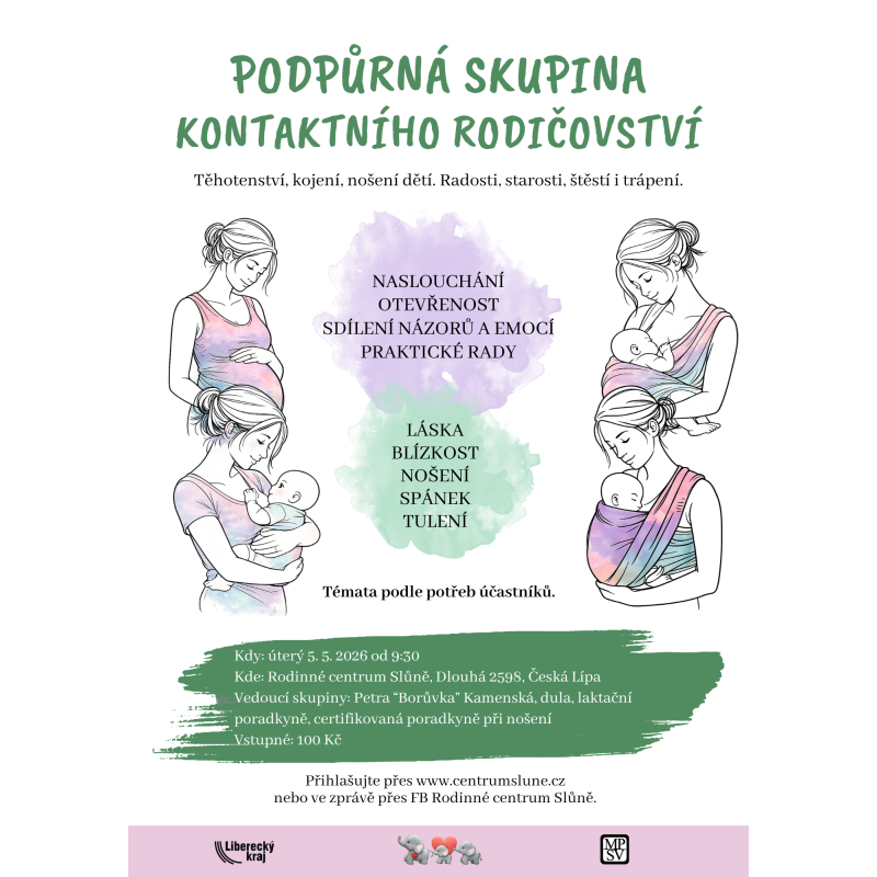 Těhotenství, kojení, nošení dětí. Radosti, starosti, štěstí i trápení. Naslouchání, otevřenost, sdílení názorů a emocí, praktické rady. Láska, blízkost, nošení, spánek a tulení. Témata dle potřeb účastníků. Podpůrnou skupinu vede Petra Kamenská.